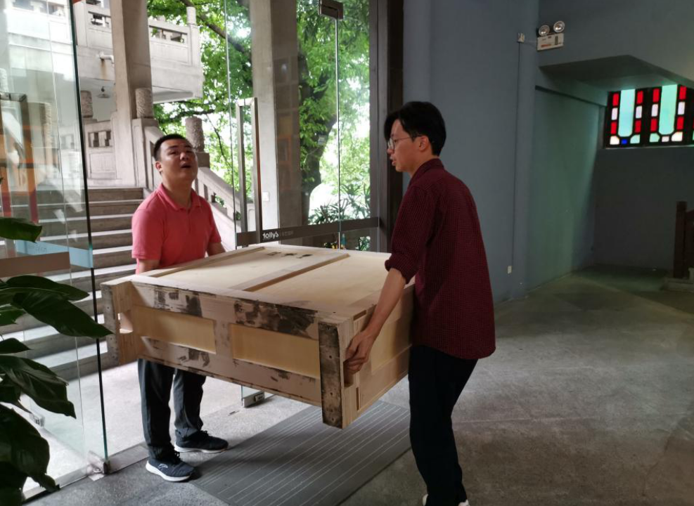 第一次收到委托人寄过来的“重量级”拍品,两位优秀的同事在帮将其挪入仓库。