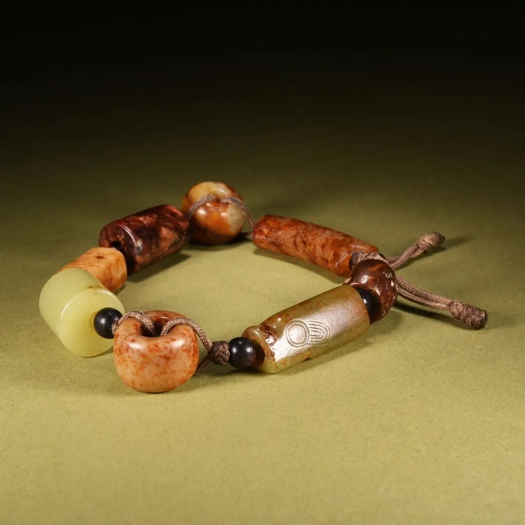 串由各色旧玉、白玉穿成手饰,色彩缤纷,均体现了材质的上乘品质,可佩可赏,着实可人。