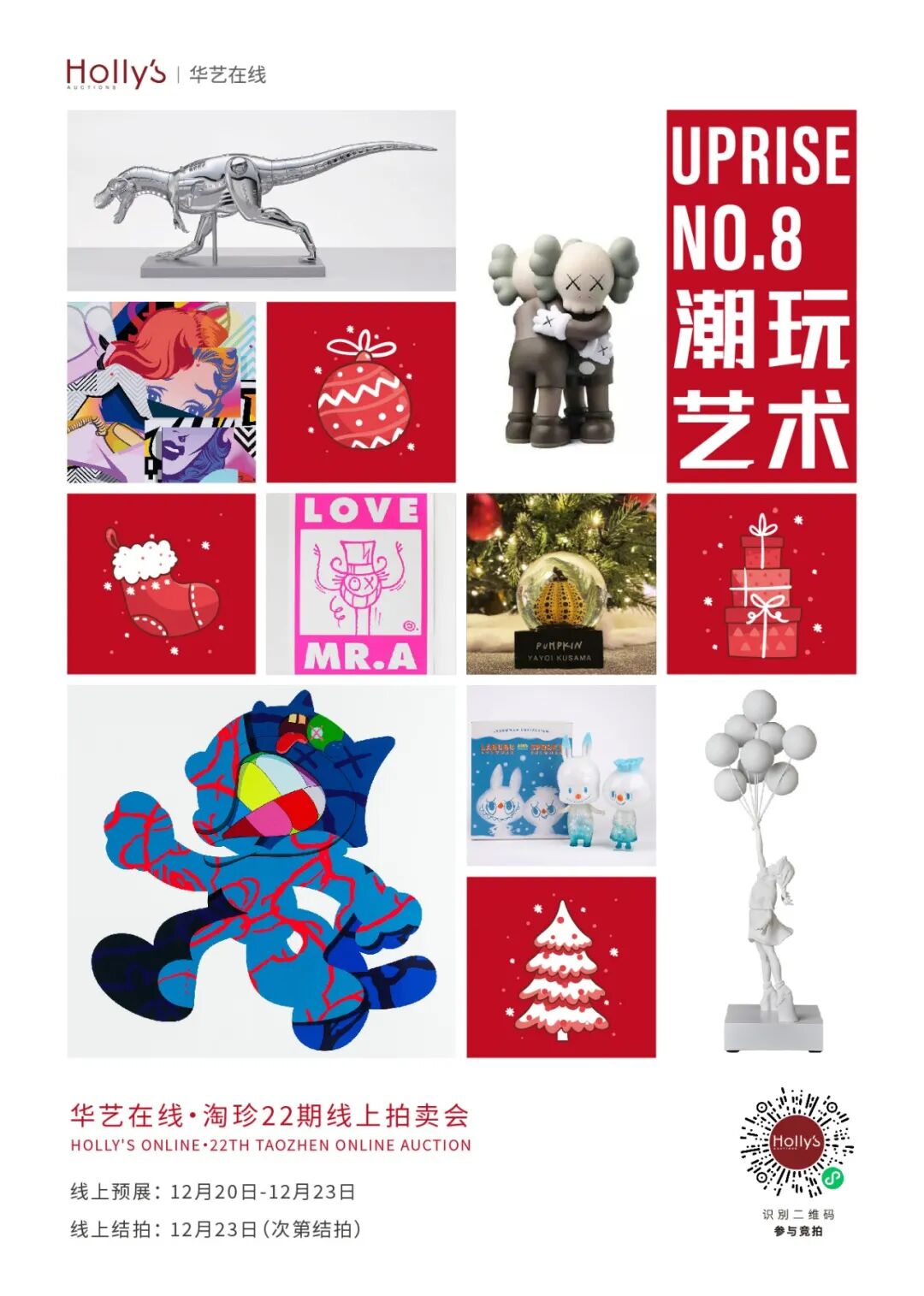 艺术正在进入每个人的日常,而潮流艺术家成为当代流行文化的风向标。华艺国际【UPRISE潮玩艺术】线上拍卖,每一期我们将会带来易入门的限量艺术拍品,即便是目前最主流潮流艺术家作品您也有机会拥有。本期“UPRISE NO.8潮玩艺术”,涵盖Kaws 、Kenny Shcarf、Andre Saraiva、村上隆、草间弥生、空山基、Daniel Arsham、龙家升等当红潮流艺术家限量版画及玩具、雕塑。