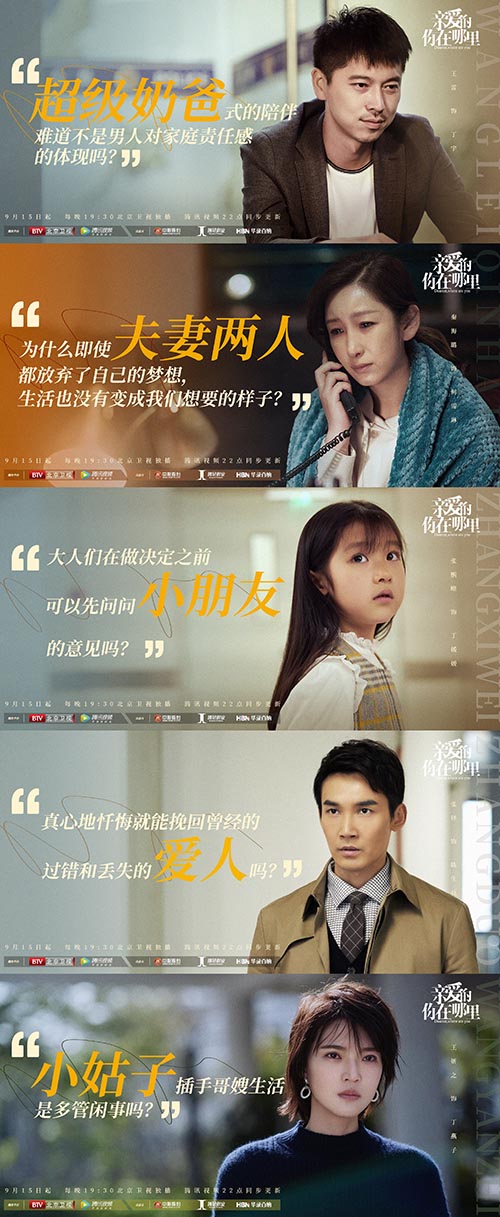 现实主义家庭关怀剧《亲爱的,你在哪里》将于今晚(9月15日)19:30登陆北京卫视品质剧场,腾讯视频22点同步播出。“找自己”终极预告片、第零集与“追随”版群像海报重磅发布,该剧戏骨云集的阵容与现实主义剧作的质感被精准传达。《亲爱的,你在哪里》由华录百纳联合出品,王迎执导,朱金晨担任编剧,王雷、秦海璐、张铎领衔主演,韩童生、范明、朱茵、杨昆特邀出演,王妍之、宋涵宇主演。