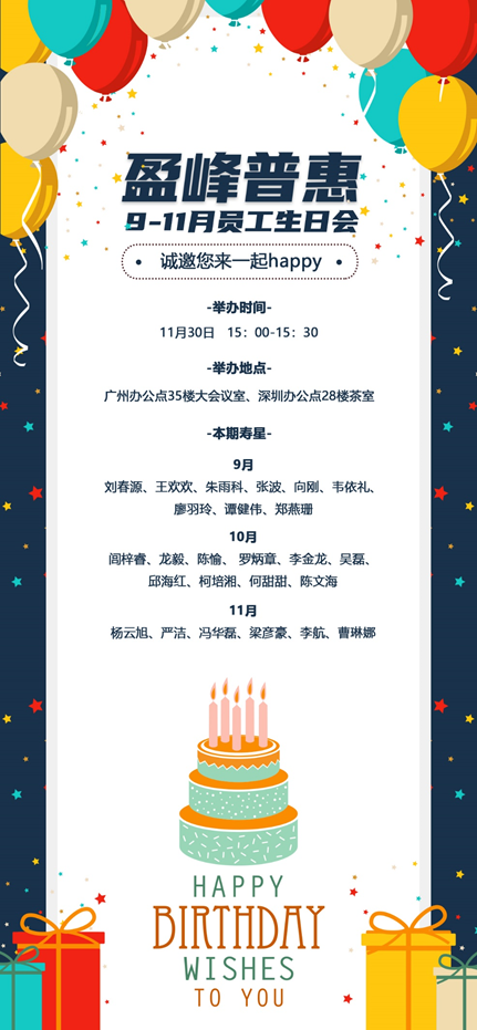 11月30日,温暖的广州,盈峰普惠9-11月员工生日会如约举行,酝酿已久,甜蜜而至